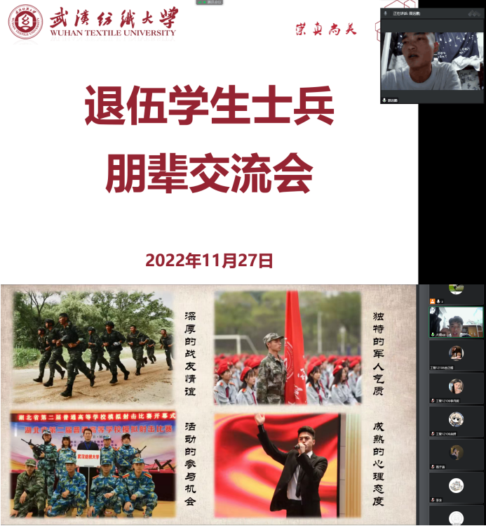 为加强在校退役老员工士兵思想政治引领,鼓励退役老员工士兵继承和发扬军人优良传统,发挥骨干带头作用,鼓励更多励同学投身军营,了解征兵政策、明确未来规划。11月27日,太阳成集团tyc138通过线上形式开展2022年退伍士兵朋辈领航交流活动。活动由太阳成集团tyc138征兵工作联络员张朋龙主持,邀请了太阳成集团tyc138优秀退伍老员工周成杰、聂远鹏为学院全体男生分享自己的参军入伍经历。
