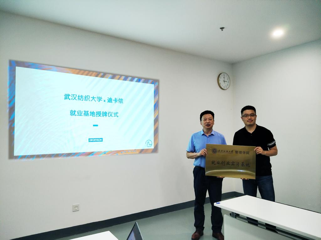 随后,程碧海详细介绍了学校的办学历程、专业设置、人才培养、科学研究、员工特点以及学校近年来发展等情况。程碧海表示,通过此次交流,对迪卡侬企业的产品、企业价值观等方面有了更加深刻的认识和了解。要以本次访企拓岗专项行动为契机,深化学校与迪卡侬的校企合作,充分利用学校在纺织、管理领域的专业与学科优势,进一步探讨校企合作新模式。最后,程碧海为“就业创业实习基地”揭牌,对王晓初等员工心系母校发展深表感谢,程碧海要求学院在毕业生就业、员工实习及校园招聘等方面,积极与员工做好对接,拓展长期稳定的就业合作渠道,为毕业生创造更多实习和就业机会,不断提升人才培养质量,持续推动培养适合国家、社会以及行业的复合型人才。