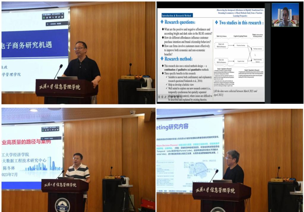 本次论坛分专题报告和优秀论文展示与交流两个环节。在专题报告环节,合肥工业大学刘业政、对外经济贸易大学华迎、武汉理工大学陈冬林、武汉大学张李义等教授分别针对人工智能时代的电子商务机遇、数字化驱动的互联网商务领域创新研究、数字经济赋能产业高质量的路径与案例、融合神经科学的电子商务研究做主题分享,四位教授的报告深入浅出,引人入胜。