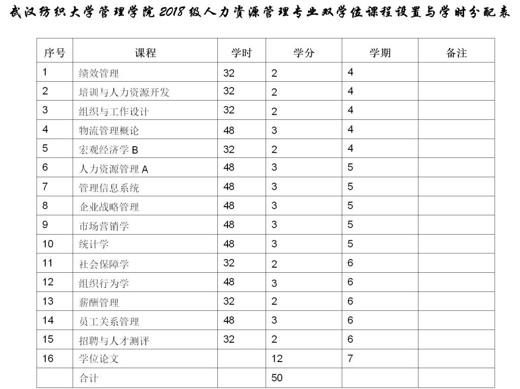 攻读本专业双学士学位的员工,应获得总学分不少于50学分,包括毕业论文12学分。具体课程设置及学分要求见课程设置与学时分配表。